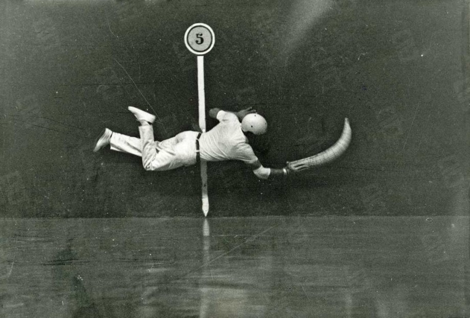 Momento en el que el pelotari salta para coger la pelota con la cesta.. Imagen de Peru Ajuria, conservada en el Museo del Nacionalismo Vasco.
